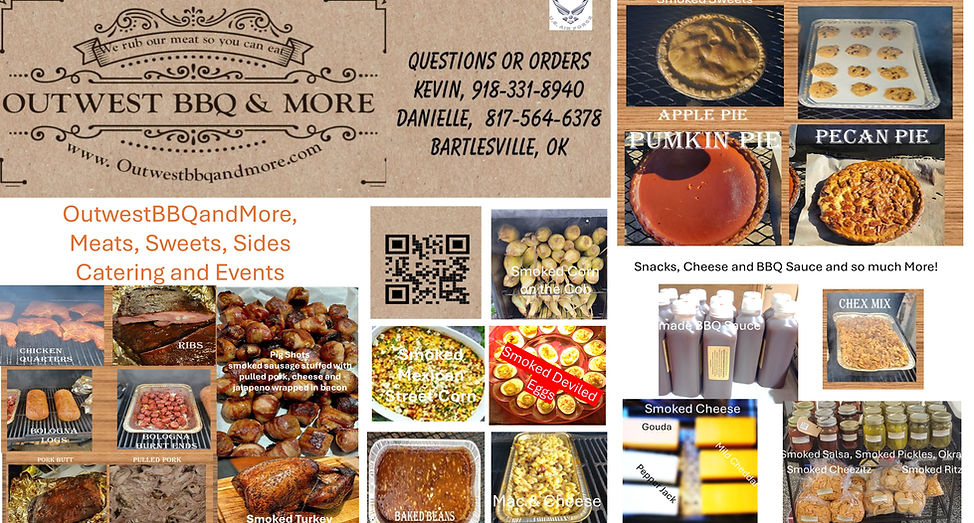 OutwestBBQandmore is always creating, inventing, and smoking brand-new favorites. Yes, we smoke everything, even peppermints! Help us create your go-to snack or meal. What does your family, office setting, or any organization need for Family Gatherings, Fundraisers, Special Requests, Holiday Meals, or Celebrations? Let Kevin smoke your favorites. Get your orders in soon!